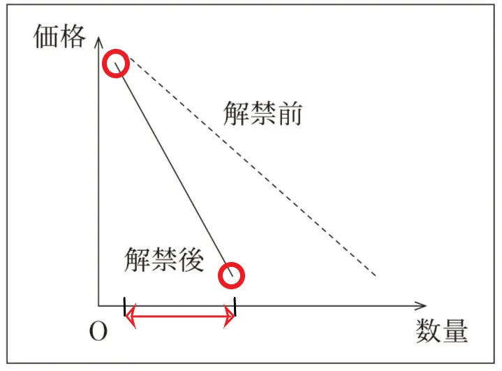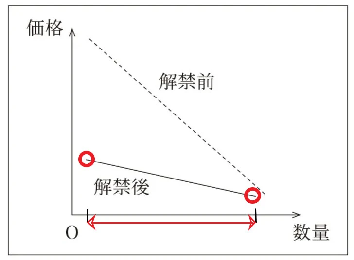解禁前よりも解禁後の方が価格変化に対する数量の変化が小さくなってしまっています。