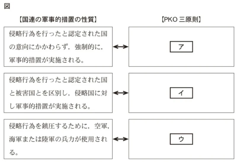 「国連の軍事的措置の性質は~であるのに対し、PKO三原則は…」のように、国連の軍事的措置の性質とPKO三原則は性質が異なる内容になります。このことを念頭に選択肢を選んで下さい。