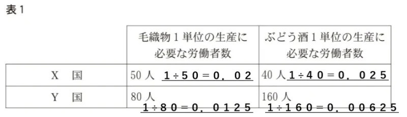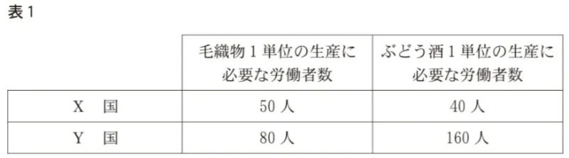 下線部aに関して、次の条件1の下でX国とY国との貿易を考える。後の表1は、貿易開始前のX国とY国において毛織物とぶどう酒のそれぞれ1単位の生産に必要とされる労働者数をまとめたものである。表1についての記述として最も適当なものを、後の回答選択肢のうちから一つ選べ。