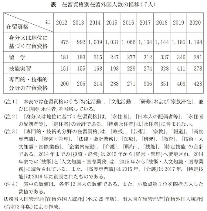 「身分又は地位に基づく在留資格」、「専門的・技術的分野の在留資格」の人数は、2019年から2020年にかけて増加しています。