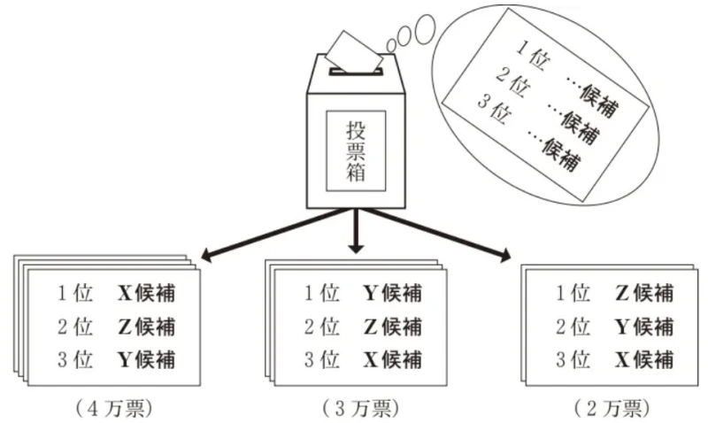 4万票で1位のX候補よりも、どの票でも3位になっていないZ候補の方が点数が高いことが分かりました。